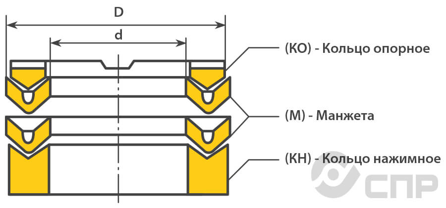 В комплекте опорное кольцо служит основой для укладывания манжет шевронных, а нажимное используется в качестве защиты уплотнений от вдавливания при воздействии высокого давления на уплотнение, равномерно распределяя его по всему профилю манжеты.